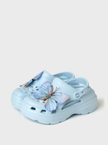 Сабо для девочки-подростка на высокой подошве. Модель выполнена из облегченного и прочного ЭВА. Материал хорошо моется.  Форма модели учитывает эргономику стопы. Оригинальность модели  придают большие съемные джибицы-бабочки. Модель имеет перекидной ремешок фиксации ноги.