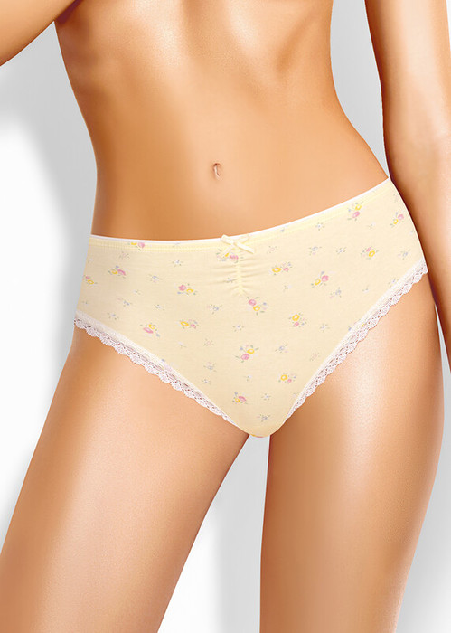 Трусы слипы женские из эластичного хлопкового полотна. Обработка краев по талии - резинка с кантом, по ноге - узкое кружево. По переду сборка на резинку, атласный бант.