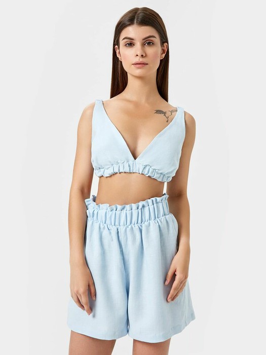 Топ с треугольными чашками, на бретелях. Бретели с втаченой внутрь эластичной тесьмой, присборены. Низ изделия обработан поясом с втаченной эластичной тесьмой.