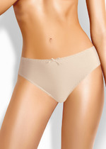 Трусы - слипы со средней линией талии и узкой боковиной. Практически полностью закрывают ягодицы.  Выполнены из высокогигиеничного хлопка, который отлично пропускает воздух, впитывает влагу, не подвержен деформации и пилингу, приятно прилегает к телу и подходит даже для самой чувствительной кожи. Края обработаны мягкими эластиками с кружевными фестонами.