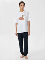 Женская пижама: рубашка прямого кроя на пуговицах с длинным рукавом и свободные брюки с поясом на резинке.
