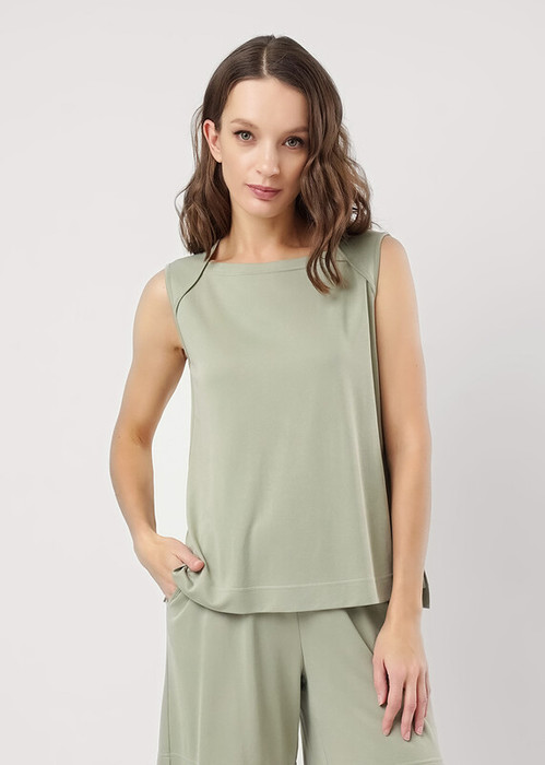 Джемпер без рукавов широкое плечо, из вискозного трикотажного полотна пике прямого силуэта. По горловине спинки и пройме окантовка. Боковые разрезы, внизу нашивка металл.