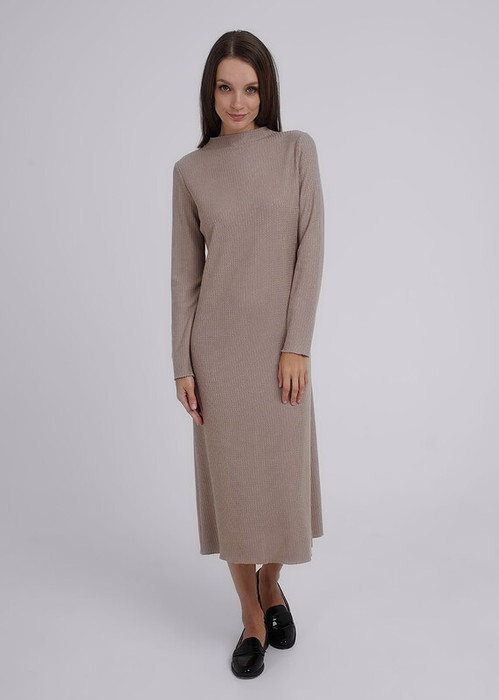 Платье из фактурного трикотажного поливискозного вязаного полотна. Прямого силуэта, длиной до колена. Динный втачной рукав. По горловине цельвыкроенная стойка. Сзади по спинке средний шов. По горловине, низу рукава и низу изделия обработка мелкий оверлок