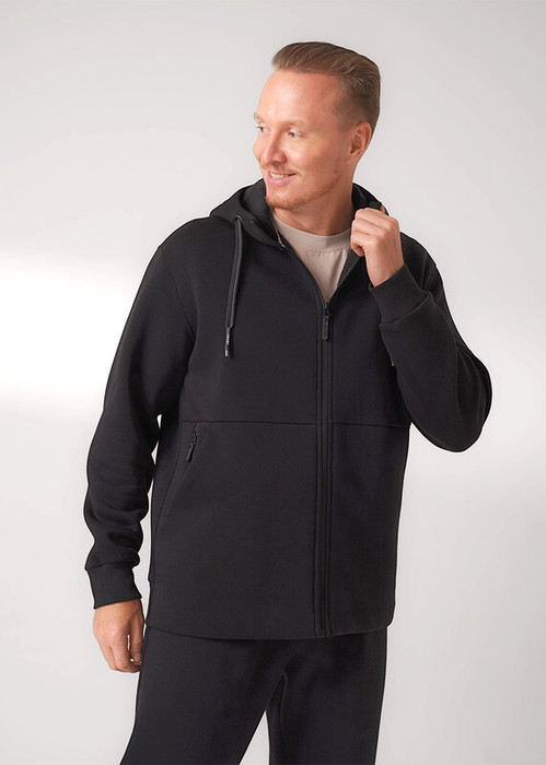 Тёплая мужская трикотажная куртка на молнии с капюшоном и вместительными карманами. Произведена из мягкого трикотажного футер с начёсом, дополнена дизайнерским принтом. Удобный и практичный вариант на каждый день.