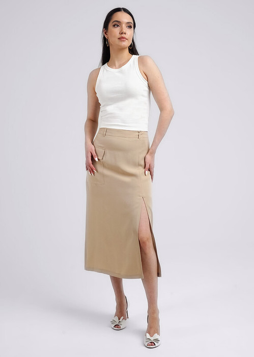 Юбка миди из текстильного полотна штапель. По талии притачной пояс со шлевками. По переду боковой разрез, справа накладной карман с клапаном. По спинке средний шов с застежкой на молнию, вытачки.