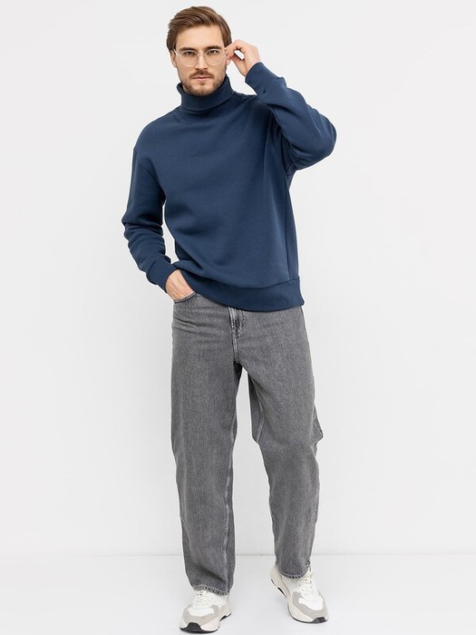 Джемпер из трикотажного футера с теплым подчесом. Силуэт прямой. Вырез горловины круглый, с воротником-стойкой из рибаны. Рукава длинные, втачные, со спущенной линией плеча. Манжеты, боковые части и пояс, проходящий по нижнему срезу, сделаны из рибаны. Стильно!