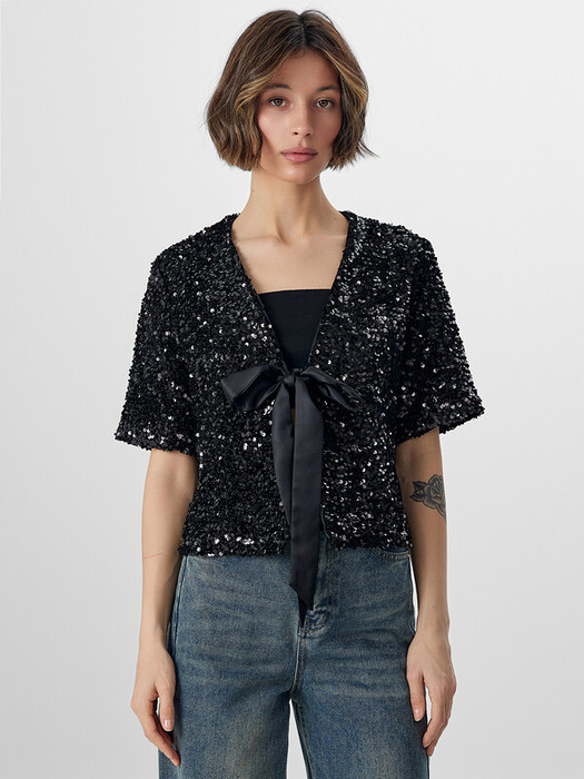 Жакет женский, выполнены из трикотажного полотна велюр с пайетками. Жакет прямой, свободный, укороченный. Горловина V-образной формы. Рукава втачные, длиной до локтя. Жакет на подкладке из сатина. По переду завязки из репсовой ленты на бант.