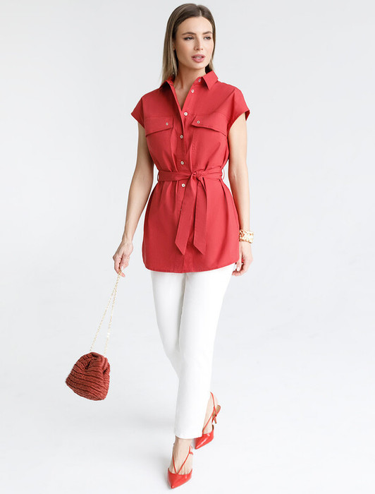 Удлиненная блузка в стиле сафари из легкого хлопкового поплина. Модель со спущенной линией плеча дополнена двумя накладными карманами. В комплекте идет пояс из основного полотна. В изделии будет комфортно, даже в самое жаркое время года. Подходит для любой фигуры. Сочетается в костюме с кюлотами D24.233 и юбкой D26.179