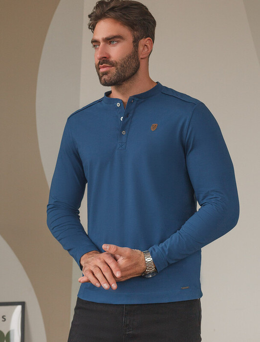 Лонгслив темно-синего цвета с длинным рукавом выполнен из премиального хлопка с эластаном,  Мягкий материал обеспечивает приятные тактильные ощущения,натуральный сосиав ткани позволяет коже дышат, удобен в повседневной длительной носке. Благодаря эластичному материалу лонгслив тяннется и создает комфортный полуприлегающий силуэт. Подходит для маленьких и больших размеров, не сковывает движения и сохраняет форму после стирки. Облегающий лонг выгодно выделяет линии тела, при этом в нем ощущается свобода движений.  Круглый ворот на металлических пуговицах создает стильный образ, который легко впишется в базовый гардероб. Тонкий джемпер дополнен нашивкой из эко кожи с логотипом бренда.