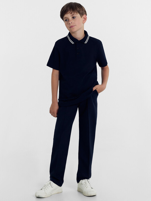 Брюки прямого силуэта из трикотажного полотна академик. Пояс с эластичной тесьмой внутри. Есть боковые карманы «хулиганы». Спереди брюки дополнены модными защипами. Штанины подогнуты. Для самых стильных мальчиков!