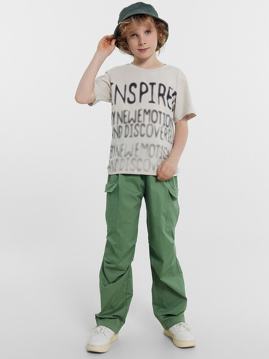Брюки для мальчиков осенне-зимнего ассортимента. Брюки карго, посадка высокая. Пояс отрезной  с эластичной тесьмой внутри, образуют сборку. По поясу проложены отделочные строчки. На передних деталях карманы с отрезным бочком. По боковым швам накладные карманы с клапаном. На середине колена, передней детали заутюженные декоративные складки. По низу брюк подгибка с эластичной тесьмой с фиксаторами, образует сборку.