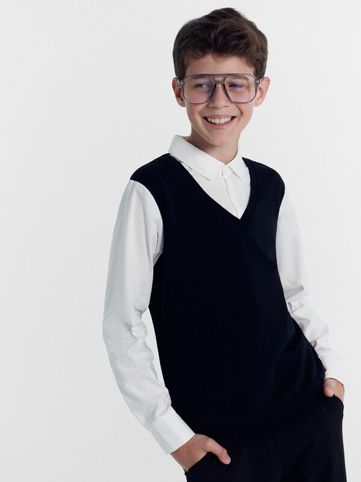 Стильный джемпер прямого силуэта для мальчиков. Вырез V-образной формы, с декоративной текстильной манишкой на пуговицах  и воротником-стойкой. Рукава с манжетами и застежкой на пуговицу. Джемпер имитирует рубашку, поддетую под жилет, и отлично подходит для школы!