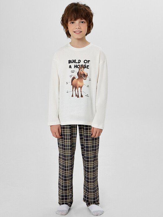 Комплект для мальчиков с юмористической надписью «Телосложение лошади» и забавным рисунком, где отмечены «переключатель внимания», «приемник угощений», «двигатель» и «водительское сидение», создан для комфортного сна и веселых дней. Пижама состоит из лонгслива и брюк, выполненных из натурального хлопка.