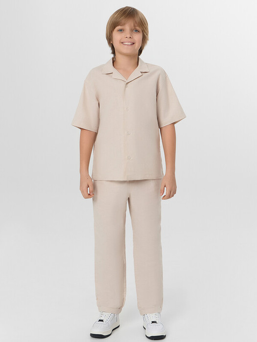 Комплект из двух предметов. Жакет прямого силуэта с воротником. По переду обработана застежка на пуговицы d=10mm и петли. Рукава короткие, втачные, слегка спущены. Нижние срезы изделия и рукавов обработаны швом в подгибку. Брюки прямого силуэта. Посадка средняя. Пояс цельнокроеный с эластичной тесьмой внутри. На поясе пробиты петли, заправлен шнур из основного полотна. По переду имитация гульфика, обработаны карманы с наклонным входом от боковых швов. Низ изделия с отворотами.
