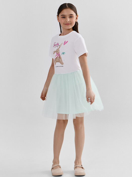 Платье для девочек свободного силуэта с отрезной юбкой.  Горловина округлой формы обработана обтачкой  из рибаны. Рукава втачные, корткие. Юбка трехслойная на сборке. Верхние два слоя из полотна трикотажного сетки, подкладка из полотна трикотажного кулирного.