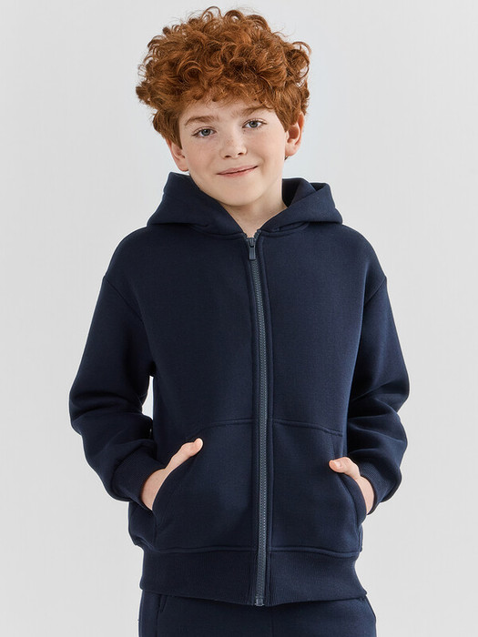 Жакет для мальчиков прямого силуэта с капюшоном. Капюшон на подкладке из основного полотна. Шов втачивания капюшона закрыт х/б тесьмой. Рукава втачные, линия плеча спущена. Притачные манжеты по низу рукавов и притачной пояс из рибаны. По переду застежка молния, карман кенгуру.