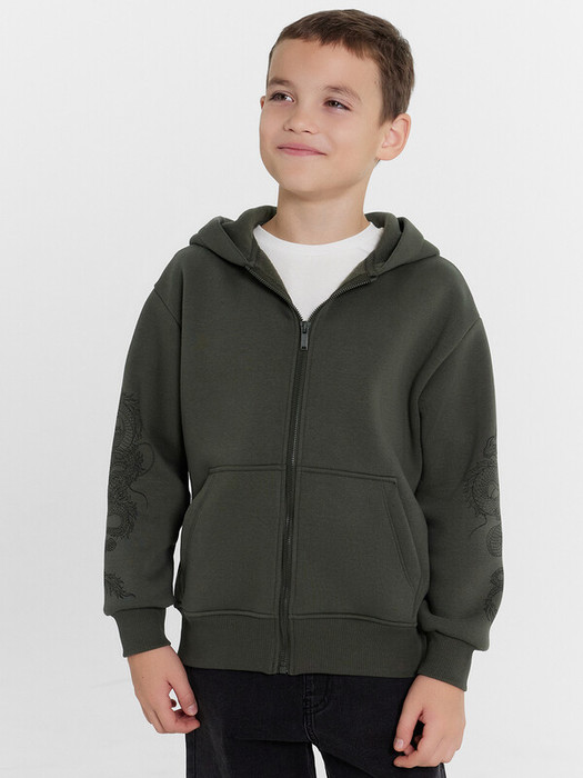 Жакет для мальчиков прямого силуэта с капюшоном. Капюшон на подкладке из основного полотна. Шов втачивания капюшона закрыт х/б тесьмой. Рукава втачные, линия плеча спущена. Притачные манжеты по низу рукавов и притачной пояс из рибаны. По переду застежка молния, карман кенгуру.