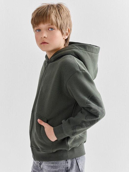 Жакет для мальчиков прямого силуэта с капюшоном. Капюшон на подкладке из основного полотна. Шов втачивания капюшона закрыт х/б тесьмой. Рукава втачные, линия плеча спущена. Притачные манжеты по низу рукавов и притачной пояс из рибаны. По переду застежка молния, карман кенгуру.