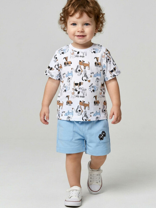Детская футболка для мальчика. Модель прямого кроя, выполнена из мягкого хлопкового трикотажа интерлок. Красочные принты с милыми собачками. Горловина круглая, обработана эластичным рибом. На плече застежка на кнопки для удобного переодевания.