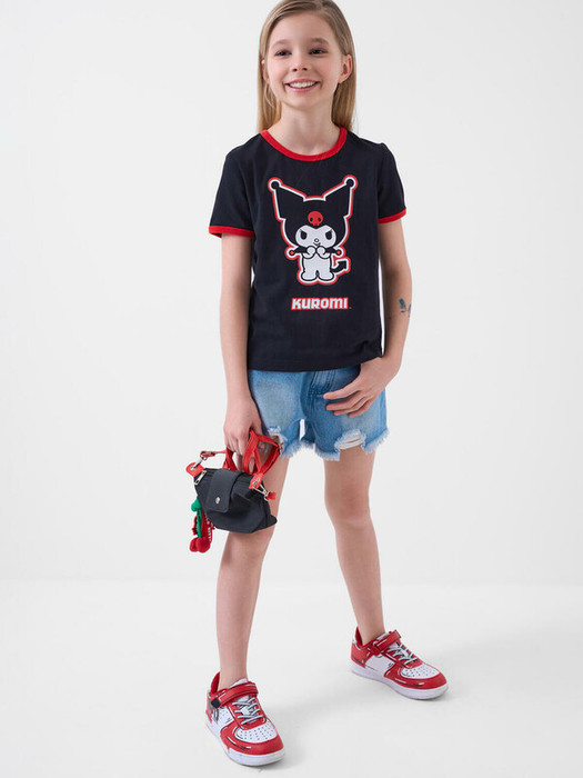 Футболка для девочки подростка. Модель прямого кроя, выполнена из эластичного хлопкового трикотажа джерси. На груди расположен крупный принт с любимым персонажем Куроми.
