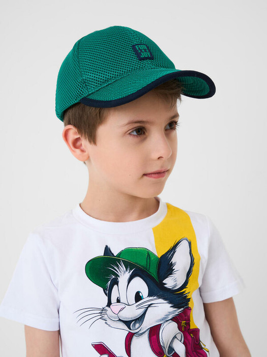 Детская бейсболка для мальчика. Выполнена из легкой дышащей сетки. Форма — классическая, с изогнутым козырьком и регулировкой объема сзади на липучке. Спереди размещена декоративная нашивка, а на заднем ремешке — контрастная надпись.