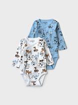 Комбинезон для новорожденного мальчика. Набор из 2 штук. Один — с ярким принтом на белом фоне с голубыми и бежевыми акцентами, второй — однотонный голубой с рисунками щенков. Модель с длинными рукавами и манжетами на запястьях и щиколотках, застегивается спереди на кнопки, проходящие до низа. Изготовлен из мягкого хлопкового трикотажного полотна — интерлока.