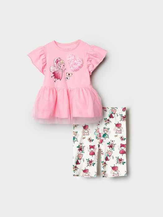 Детский комплект для девочки. Состоит из футболки с короткими рукавами и укороченных легинсов. Футболка выполнена из хлопкового трикотажа джерси и украшена милым принтом с феей, бабочками и объемным сердцем-аппликацией. Низ футболки оформлен воздушной баской из сетки, которая придает изделию нарядный вид. Для удобства переодевания на плече предусмотрены кнопки. Легинсы выполнены из мягкого трикотажа с нежным рисунком. Пояс эластичный, обеспечивает комфортную посадку.