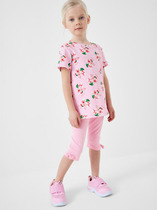 Нежный детский костюм для девочки. Состоит из футболки и шорт. Выполнен из мягкого вязаного трикотажа с ажурным узором, благодаря чему комплект выглядит легким и воздушным. Футболка имеет свободный прямой крой и круглую горловину. Проймы украшены декоративными крылышками, а низ оформлен волнообразным краем, что придает модели нарядный вид. Шорты свободного силуэта, с комфортным поясом на резинке и дополнительным шнурком для регулировки.