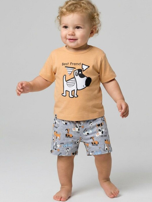 Детский костюм для мальчика. Состоит из футболки и шорт. Выполнен из хлопкового трикотажа. Футболка прямого кроя, с коротким рукавом. На плече застежка на кнопки для удобного переодевания. Яркий принт с милыми собаками. Шорты свободные, с эластичным поясом и шнурком для регулировки посадки.