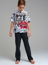 Комплект: футболка, брюки. Размер изделия на фото - 110, параметры модели (см): рост 110, обхват груди-талии-бедер: 58-54-60. Из качественного эластичного и приятного на ощупь трикотажа джерси. Высокое содержание хлопка 95%. Благодаря наличию эластана в составе ткани изделие держит форму и меньше мнется. Принт сохраняет первоначальный вид даже после многочисленных стирок. Эластичный пояс с тесьмой позволяет легко надевать и утягивать до идеальной посадки в зависимости от комплекции ребенка. Нижняя кромка брючин в эластичный рубчик.