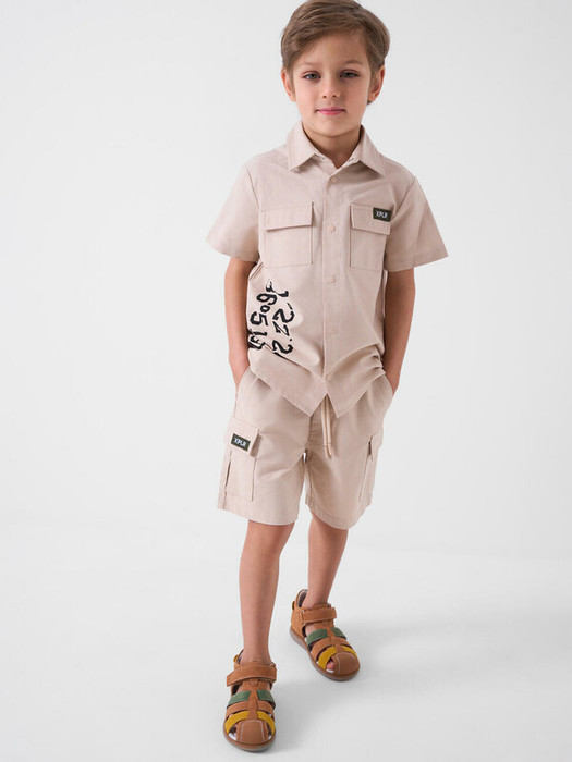 Легкий детский хлопковый костюм для мальчика. Рубашка прямого кроя с коротким рукавом и застежкой на кнопки. Классический воротник, накладные карманы. Свободные шорты на резинке со шнурком для регулировки. Удобные боковые карманы и карманы-карго.