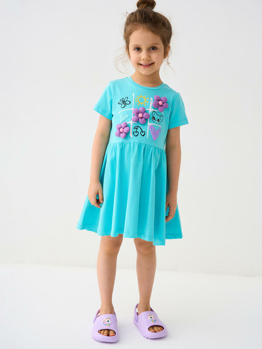 Детское платье для девочки. Модель с короткими рукавами, средней длины — до колена. Выполнено из мягкого хлопкового трикотажа джерси. Верхняя часть прямая, юбка со сборкой по талии создает легкий объем. Украшено красочным принтом.