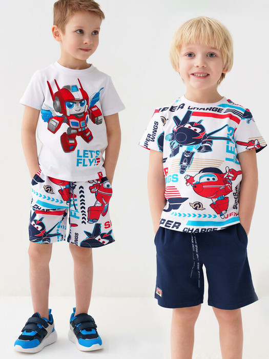 Набор детских шорт для мальчика. В комплект входят две пары шорт свободного кроя. Модели из мягкого, хлопкового трикотажа джерси. Удобная посадка обеспечивается эластичным поясом со шнуром. По бокам расположены два кармана.