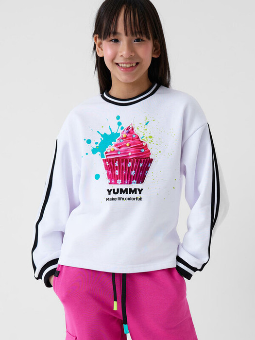 Свитшот оверсайз для девочки подростка. Выполнен из хлопкового футера без начеса. На передней части — выразительный принт с капкейком. Низ изделия и рукава оформлены эластичными резинками. Модель укороченная, длиной до бедер.