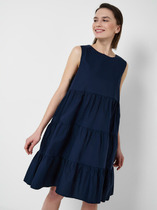 Платье-жилет прямого силуэта из плательной ткани с разрезами в боковых швах. Изделие со спущенной линией плеча, без вытачек, на запахе. Лацканы воротника и края борта асимметричные. Накладные карманы со скошенной линией входа в карман. Пояс из основной ткани в комплекте. Во избежание потери пояса, пояс зафиксирован в боковом шве изделия временным швом, его легко удалить.