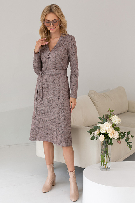 Платье полуприлегающего силуэта из эластичного полотна с принтом, имитирующий твид. Втачной длинный рукав. V-образный вырез горловины, оформлен бейкой и украшен пуговицами. Пояс в комплекте.