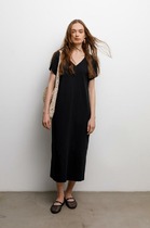 Платье свободного силуэта из плательной ткани. По центру передней части изделия выполнен шов. Цельнокроеная стойка, переходящая в V-образный вырез горловины, визуально делает фигуру стройнее. Втачной длинный рукав с центральным швом и декоративным разрезом по низу рукава.