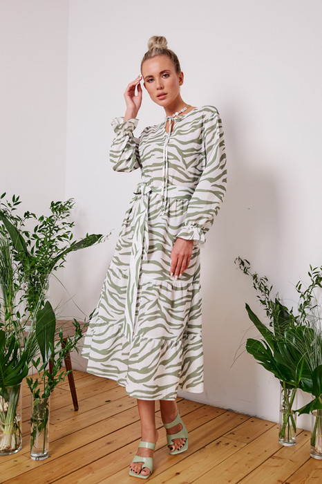 Платье свободного силуэта из плательной ткани. Изделие отрезное по линии талии, с ярусами на юбке. Втачной рукав в романтическом стиле, присборен на резинку. V-образный вырез горловины с декоративной завязкой. В комплекте пояс из основной ткани. В таблице размеров представлены параметры человека, а не изделия.