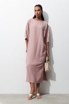 Платье из вискозной плательной ткани полуприлегающее в области груди и свободное в области бедер. Изделие отрезное по линии талии с застёжкой на пуговицы. В боковых швах карманы. V-образный вырез горловины, визуально делает фигуру стройнее. Втачной короткий рукав с защипами по низу рукава и манжетой. В комплекте пояс из основной ткани.