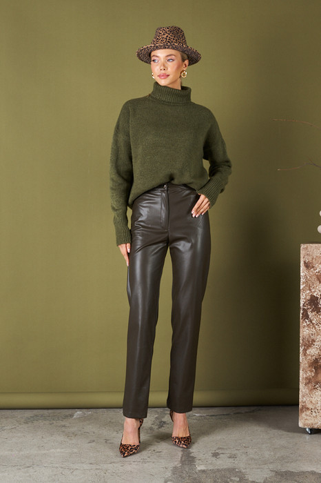 Брюки из эластичного полотна, с покрытием, имитирующим кожу, зауженные книзу. На передней части брюк карманы с подкройным бочком. Притачной пояс, застёжка на металлическую молнию-гульфик и кнопку.