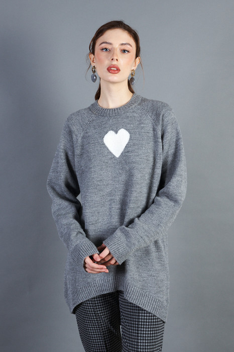 Джемпер свободного силуэта с узором «сердце» в области груди. Низ изделия асимметричной длины (спинка удлинена относительно переда). Длинный рукав-реглан. Круглый вырез горловины, низ изделия и низ рукава оформлены резинкой. Изделие выполнено из мягкой меланжевой пряжи.