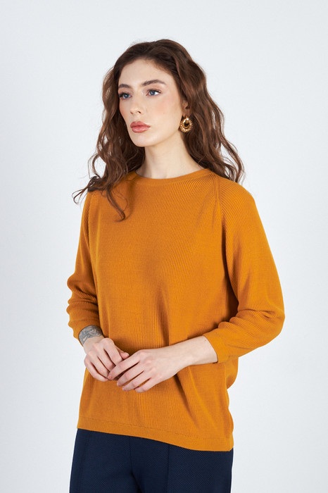 Джемпер прямого силуэта с фактурой «жемчужный узор». Рукав реглан. Круглый вырез горловины, низ изделия и низ рукава оформлены резинкой. Изделие выполнено из мягкой структурированной пряжи.