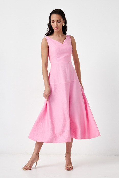 Платье на бретелях, отрезное по линии талии из вискозной ткани с крэш-эффектом. Изделие, прилегающее в области груди и свободное в области бедер. Нижняя часть платья по силуэту колокол с кокеткой. Лиф двухслойный с красивым женственным вырезом и рельефными швами от проймы. По среднему шву спинки застежка-молния.