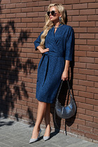 Платье отрезное по линии талии из фактурной плательной ткани. Изделие, прилегающее в верхней части и расширенное книзу. Глубокий V-образный вырез горловины плавно переходит в запах, фиксируется притачным поясом. Втачной длинный рукав.