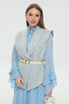 Жилет полуприлегающего силуэта с застёжкой на пуговицы из костюмной ткани. На передней части изделия нагрудные вытачки переведены в рельефы и линию кармана. Карманы прорезные, с листочкой. Спинка со средним швом, рельефами и плечевыми вытачками. Длина жилета до уровня линии бедер. Жилет на притачной подкладке.