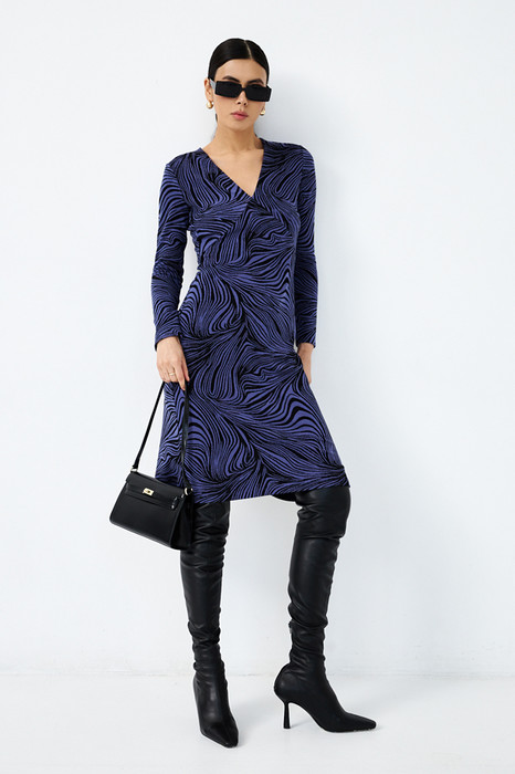 Платье полуприлегающего силуэта, расширенное книзу из эластичного полотна с жаккардовым узором. Боковые швы смещены в сторону переда. На передней части, ниже линии груди, выполнены рельефы. Линия рельефа начинается от выреза горловины и заканчивается в боковом шве на уровне выше линии талии. V- образный вырез горловины. Спинка со средним швом и талиевыми вытачками. Втачной длинный рукав.