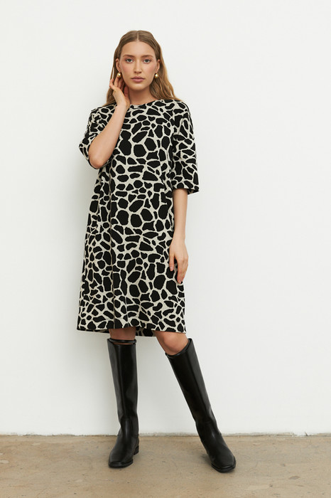 Платье свободного силуэта выполнено из эластичного полотна с жаккардовым узором. Изделие со спущенной линией плеча и рукавом до локтя. Вырез горловины оформлен бейкой из основной ткани. В таблице размеров представлены параметры человека, а не изделия.