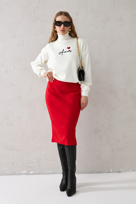 Юбка прилегающего силуэта с эластичным поясом и разрезом в боковом шве. Изделие выполнено из мягкой структурированной пряжи.