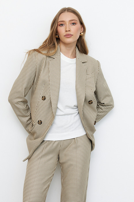 Двубортный жакет из костюмной ткани. Изделие полуприлегающего силуэта с английским воротником и застежкой на пуговицы. На передней части жакета выполнен нагрудный карман с листочкой и карманы в рамку с клапаном. По центру задней части выполнена шлица - элемент декоративный и необходимый. Обеспечивает свободу движения, добавляет шику и элегантности. Втачной длинный рукав, снизу имитация шлицы с пуговицами. Изделие идеально держит форму, имеет четкую линию плеча благодаря плечевым накладкам. Жакет на подкладке.