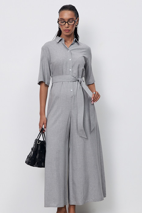 Стильный комбинезон из комфортной вискозной ткани. Свободный силуэт с застёжкой на пуговицы, в боковых швах карманы. Втачной короткий рукав. Вырез горловины обработан отложным воротником на стойке. Изделие с заниженной линией сидения обеспечивает комфортное движение. В комплекте пояс из основной ткани.